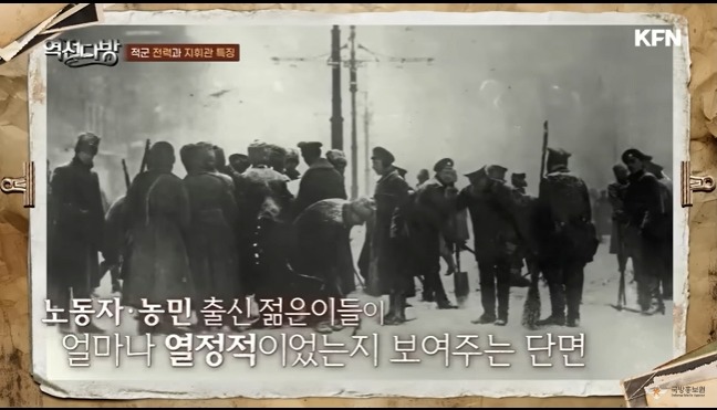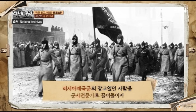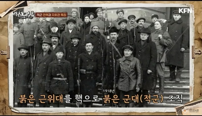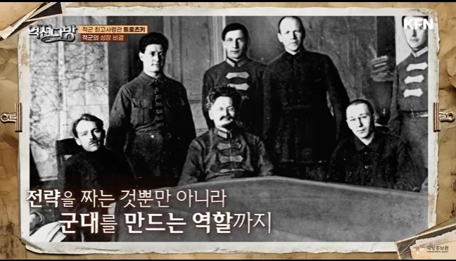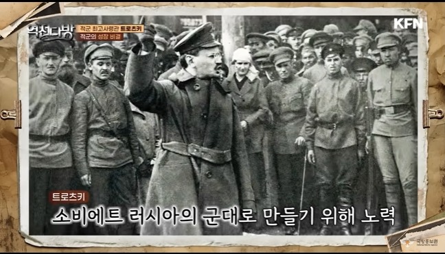 적군에는 걸출한 조직 관리자가 있었다.바로 트로츠키였다.트로츠키는 러시아의 외무장관격인 외무위원이였다.군대에 대한 지식이 없었다.하지만 경영 마인드가 있었고 조직관리에 탁월한 리더였다.이 능력으로 트로츠키는 국방부장관과 총사령관직을 겸직하게 된다.적군을 체계화하고 백군을 무너뜨리는 중책이 그에게 맞겨진다.트로츠키는 징병제를 만들게 된다.일선에 부대들을 돌면서 사상을 무장시키고 장벽부대도 만든다.전투중에 도망가는 병사들을 잡아서 처단하는 부대다.징병시스템을 쳬계화하는데 각고의 노력을 기울이게 된다.이런 노력은 효과를 본다.초기에 몇십만도 안된는 군대가 나중에는 500만가까이 불어나게 된다.사병은 충당했고 이젠 장교도 충원해야 했다.트로츠키는 러시아 제국 시절 장교들을 포섭하기로 한다.내부에 반발이 생긴다.혁명의 의미가 퇴색되는 것이였다.반혁명세력인 이들에게 군권을 주면 무슨일이 벌어질 지 몰랐다.트로츠키는 이를 막기위해 장교의 가족을 볼모로 잡게 된다.또한 정치위원을 만들게 된다.정치위원은 노동자혹은 농민출신이였다.이들을 묶어서 견제와 협력하게 하는 방법을 구상하게 된다.귀촉출신인 구러시아 장교들은 의외로 적군에 협력하게 된다.이들은 백군을 외국 세력이 도와주는 것을 보면서 민족의식이 불타게 된다.