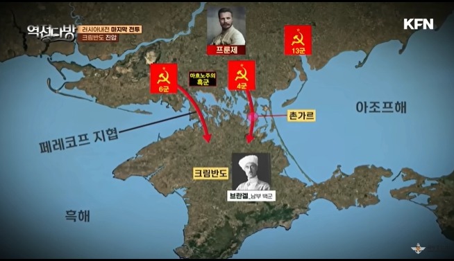 아직 백군은 숨통이 붙어있었다.브란겔의 백군이 북진을 하게 된다.백군 규모가 15만 정도로 작지 않았다.이곳을 진압하기 위해 프룬제가 투입된다.남부백군은 크림반도의 지형적 이점을 살리며 방어진을 꾸리게 된다.이곳은 바다로 가로막혀서 접근이 쉽지 않은 곳이다.현재는 다리로 연결되있지만 당시는 그런게 없었다.그리 넓지는 않고 경포호 처럼 석호였다.바닷물이 빠지면서 육지가 넓어지며 도하를 할 수 있는 수준이 되버린다.마흐노 기병대가 여기를 째빠르게 도하 남백군을 치게 된다.프룬제는 더 확실하게 하기 위해 마흐노의 녹군도 미리 포섭하는 치밀함을 보인다.크림반도에서 저항하던 마지막 백군은 최후를 맞게 된다.