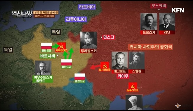 1920년 7월 러시아 적군은 폴란드를 국경 밖으로 후퇴시키게 된다.레닌은 이 참에 혁명을 수출하자며 바르샤바를 목표로 진군하자 주장한다.러시아는 사회주의 혁명은 거의 성공이 눈앞에 왔지만 다른 서유럽 상황은 여의치 않았다.사회주의 혁명이 일어나려다가 힘을 못쓰는 상황이였다.레닌은 무력을 동원해서 사회주의를 전파하려 든다.많은 반대에 부딪힌다.병참선도 길어지고 내전이 이제 막 봉합되고 있는데 여기서 다른 나라와 전쟁하는데 회의적이였다.하지만 레닌의 강력한 주장에 트로츠키도 동의하고 이 침공에 투하쳅스키를 투입한다.남부전선에는 스탈린과 보로실로프가 나선다.스탈린은 트로츠키의 폴란드 침공에 반대하는 입장이였다.집안단속만 잘하고 우리끼리 잘살면 되지 굳이 공산주의 수출까지 할 필요가 있나라는 생각을 가진다.이러다 보니 투하쳅스키와 보로실로그 사이에 협조가 잘안되게 된다.