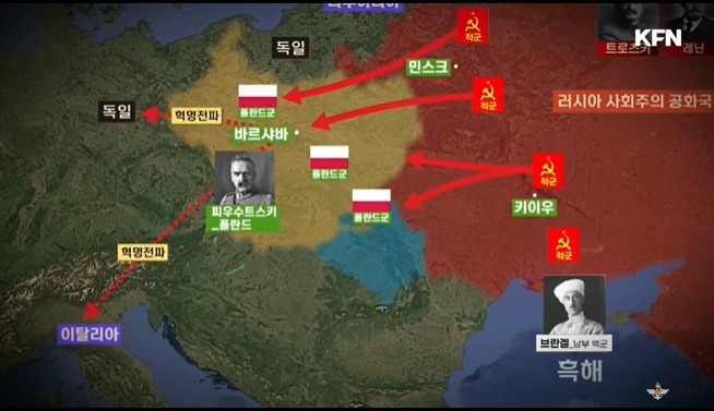 내란이 평정되나 싶었으나 다시 격랑으로 빠져든다.독립을 시도하려던 우크라이나가 이 때를 기회로 본 것이다.그러면서 폴란드에 SOS 를 치게 된다.폴란드는 아주 좋은 기회로 생각한다.기세를 몰아 러시아 서쪽으로 침략해 들어가게 된다.적군은 아니 예전에 우리 영향력 아래에 있던 놈이 공격한다며 대응 태세에 들어가게 된다.폴란드의 침공은 백군과 적군이 싸우는 내전과는 달랐다.이 때까지 중립을 표방하던 명장들이 조국이 침탈당하는 것은 참을 수 없다며 볼셰비키에 협력하게 된다.1차대전 명장 브루실로프가 복귀하고 그는 조국을 지키자며 칩거하는 명장들에게 메시지를 내게 된다.여기에 많은 장교들이 화답하게 된다.