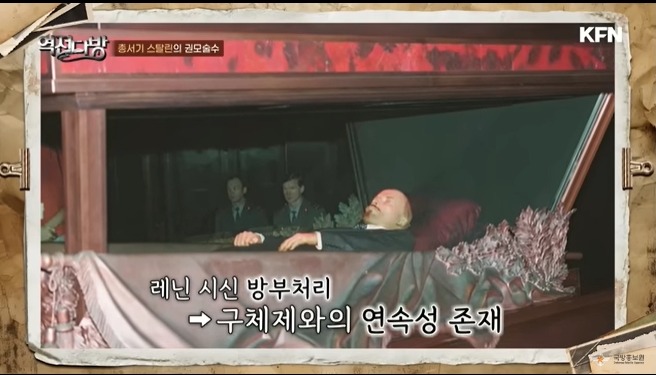 스탈린은 당시 서기장이였다.비서 역할로 당의 자금과 인사를 쥐고 있었다.이러다 보니 레닌 사후 권력의 무게 추가 스탈린으로 옮겨가게 된다.그대로 이 직책이 지도자 직함이 된 것이다.레닌은 특히 스탈린을 불러 인종차별 발언까지 서슴치 않는다.스탈린은 그루지아 사람이였는데 레닌은 이를 문제삼아 스탈린을 멸시하게 된다.스탈린은 허허실실하며 웃어 넘기며 레닌에게 대들지 않았다고 한다.1924년 1월 21일 레닌이 사망한다.스탈린은 앞장서서 레닌의 시신을 운구하는 대열 앞에 서게 된다.레닌은 유언으로 자기가 죽으면 엄마 옆에 묻어달라고 하나 스탈린은 이를 거부한다.공산주의 사상에서 신은 없다.하지만 이를 일반 민중이 받아들이기는 매우 어려웠다.뭔가 종교를 대신할 실체가 필요했다.레닌의 시신을 방부처리하고 일반 대중들에게 레닌의 사상을 믿고 받아들이면 잘 살 수 있다는 교리를 만들어 낸다.스탈린 역시 레닌을 존경하고 있었다.독일이 소련을 침공하자 레닌이 힘들게 싸아온 소련을 무너뜨릴지도 모른다는 자괴감에 빠졌다고 전해진다.