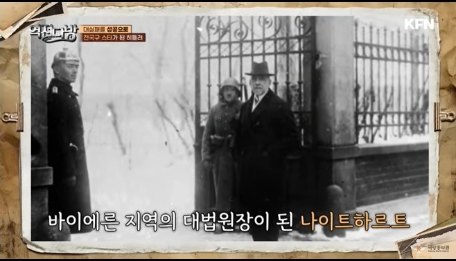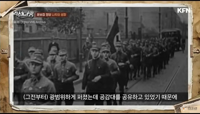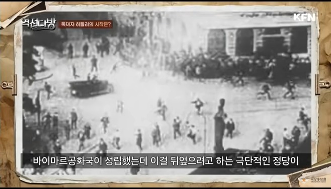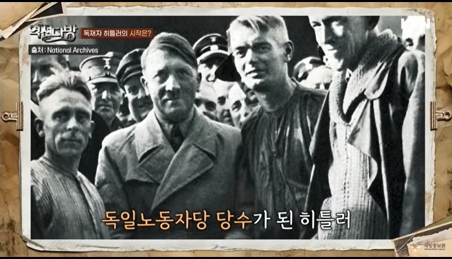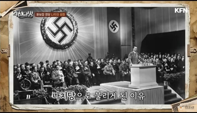 히틀러에게도 발언 기회가 온다.히틀러는 그동안 자신이 생각한 것들을 말하게 된다.당원들은 깜짝 놀란다.우레와 같은 박수가 쏟아지게 된다.히틀러는 이 날 연설로 발언 기회가 점점 많아지게 된다.처음에는 노동자들만 모이다가 소문이 퍼져 동네 방구좀 낀다는 사람도 속속히 집결하게 된다.히틀러는 판이 커지자 연설에 공을 들이고 연설문도 미리 작성하는 듯 심혈을 기울인다.히틀러는 1차대전 중 독가스를 들이마셔 오랜 후송생활을 하게 된다.여기서 강군 독일이 왜 패했을까를 계속 곱씹게 된다.당시에 유대인 음모론에 있었는데 여기에 자신의 생각이 더해지게 된다.독일의 패전은 영미와 결탁한 자본가와 유대인 때문이라는 생각을 쳬계화한다.이 생각을 그대로 말로 내뱉자 사람들은 열광하게 된다.노동자 당원들도 이 생각에 공감하고 있었다.결국 히틀러는 독일 노동자당 당수가 된다.여기서 히틀러는 자신의 사상을 더욱 공고히 한다.이탈리아에서 무솔리니가 파솔리니 정권을 세우자 여기에 고무된다.국가와 민족 그리고 사회주의를 합쳐 국가 사회주의 노동자당 즉 나치당을 만들게 된다.