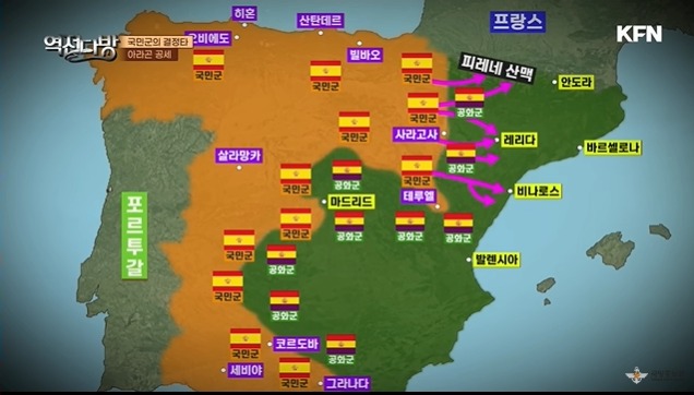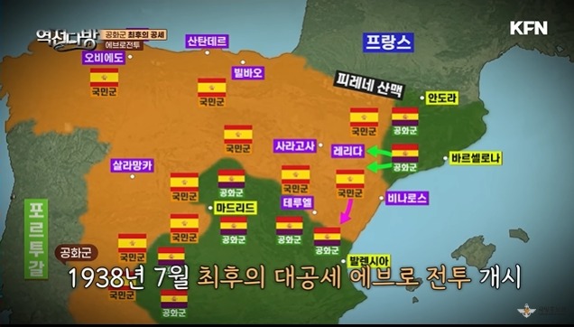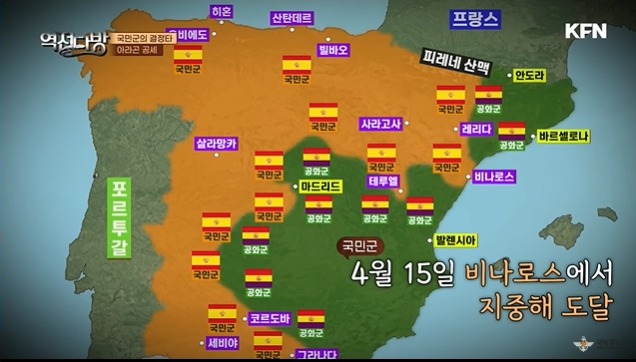 프랑코는 공화군이 에브로전투를 통해 자살골을 넣자 골을 더 넣기 위해 더 공세를 펼친다.1939년 1월 26일 바르셀로나가 국민군 손에 들어가게 된다.공화군은 힘이 빠지고 이제 서로 너탓이라며 싸우기 시작하며 자멸하게 된다.결국 마드리드까지 무너지며 프랑코는 스페인을 먹게 되고 프랑코는 이때부터 30년 이상 스페인을 통치하게 된다.스페인 내전은 참혹했다.스페인 론다 지역에 누에바 다리라는 곳이 있다.여기서 국민군은 공화군에 협조한 사람들을 일렬히 세운 후 밀어서 죽여버린다.같은 국민임에도 생각이 다르다는 이유로 죽여 버린 것이다.이런 백색테러는 스페인 곳곳에 일어났고 스페인 전역에 난민들이 속출하게 된다.스페인 내전은 어찌보면 반파시즘과 파시즘싸움이였는데 여기서 파시즘이 이겨버린 결과가 초래된다.