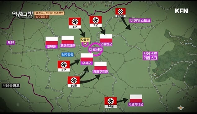 폴란드는 바르샤바가 조이기를 당하자 이를 풀기 위해 대규모 공세를 단행한다.폴란드군 25만과 독일군 35만이 격돌하게 된다.독일군 후방을 교란하고 일부 포위하며 성과를 내는 듯 했다.독일 공군이 등장하고 슈투카의 융단 폭격이 단행되면서 폴란드군은 무너지기 시작한다.폴란드 수도가 위험함에도 프랑스는 독일의 지그프리드선에서 산발적 도발만 하고 구경만 하게 된다.브주라 전투로 폴란드는 막대한 손실을 입게 된다.결국 폴란드군은 동부로 피신하게 된다.폴란드 지형은 서쪽은 평원이고 동쪽은 자연 장애물이 많은 은 지역이라 방어가 용이했다.