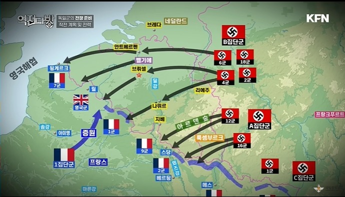 독일 B 집단군은 제압당한 요새로 전차를 투입하며 속도전을 펼치게 된다.연합군은 튼튼한 요새라 믿었던 벽이 속절없이 무너지자 다급해진다.독일군이 벨기에 네덜란드로 오고 있다며 여기에 증원군을 투입하게 된다.독일의 주력은 A집단군쪽이였는데 B집단군이 세게 밀고 들어오니 여기가 주공이라 믿게 된다.독일 신문도 마치 여기가 주공인 것처럼 보도를 하며 기만술을 펼치게 된다.프랑스군 총사령관 가믈랭은 독일군 집결지에 폭격은 하지 말라는 명을 내리게 된다.독일 공군에 쨉만 날리는 수준에 대응만 하라는 것이다.프랑스는 독일 공군의 역습이 두려웠고 공군 힘을 비축해야 나중에 반격 작전시 써먹을 수 있다는 생각에 빠져 있었다.독일 공군은 더 활개를 치며 연합군을 공격하게 된다.