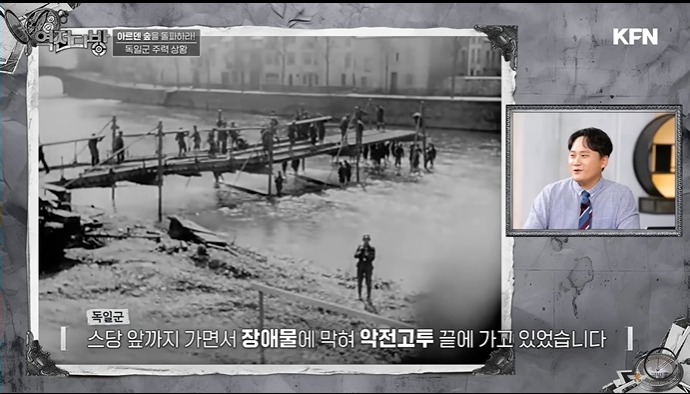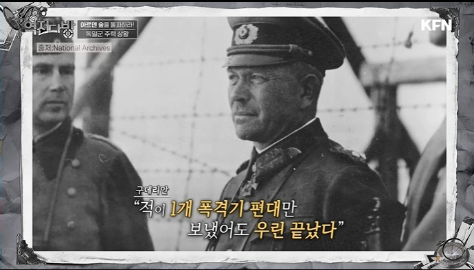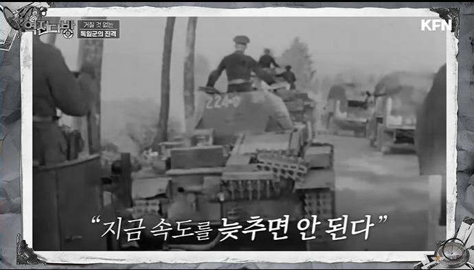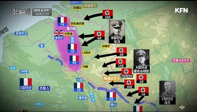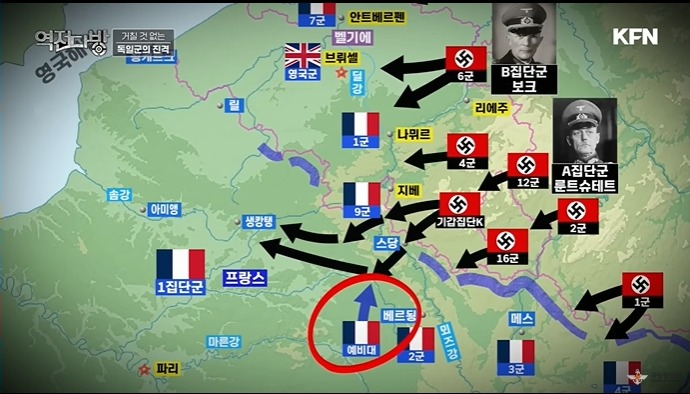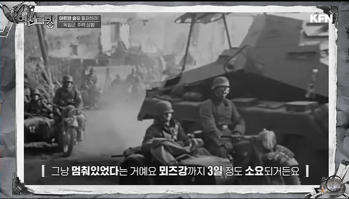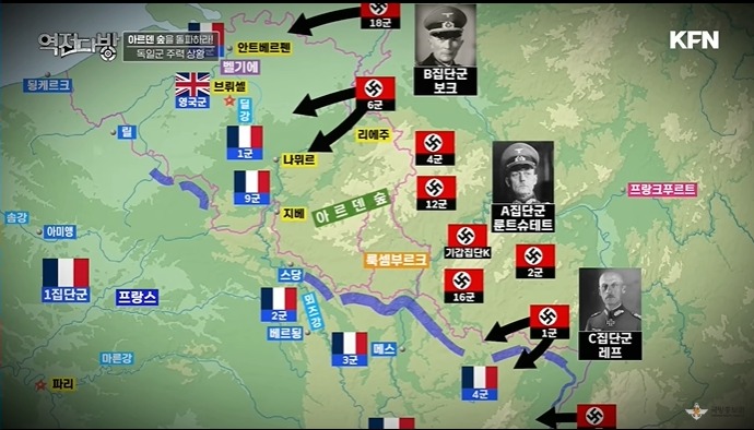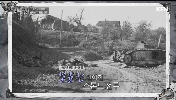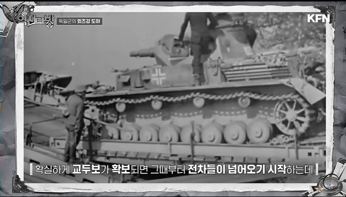 1940년 5월 13일 구데리안이 이끄는 19군단이 스당에 당도하게 된다.프랑스는 적어도 5월 18일 까지 걸리지 않을까 생각했는데 독일 선두부대가 너무 빨리 왔다.구데리안은 보병을 기다렸다가 돌파하면 늦다고 생각한다.기갑 집단 사령관 클라이스트는 보병을 기다렸다 전진하라 하면서 구데리안과 의견 충돌을 보이게 된다.구데리안은 항공 사령관 뢰어처와 작당 모의를 하게 된다.당시 공군은 지상 포격을 위해 공군 장교가 육군에 배속되어 같이 이동하는 구조였다.공군 입장에서 기갑과 합동 작전을 펼치는 거 한 번 해보고 싶었는데 이걸 할 수 있게 된다.스당은 작살이 나게 된다.보병들이 먼저 뫼즈강을 도하하고 공병들이 다리를 가설하면서 전차부대가 일제히 뫼즈강을 넘게 된다.여기에 프랑스군 포병이 상당수 배치되어 있으나 스투카가 이를 붕괴시켜 버리면서 사실상 프랑스군은 적의 도하를 구경만하게 된다.프랑스군은 혼비백산하게 된다.사령부가 뒤로 빠지자 일선 부대들은 공황 상태에 빠진다.황당한 일도 일어난다.정신없는 와중에 프랑스군 탱크를 독일군 탱크로 오인하여 사방간데서 적이 몰려오고 있다며 스스로 위기를 자초하게 된다.