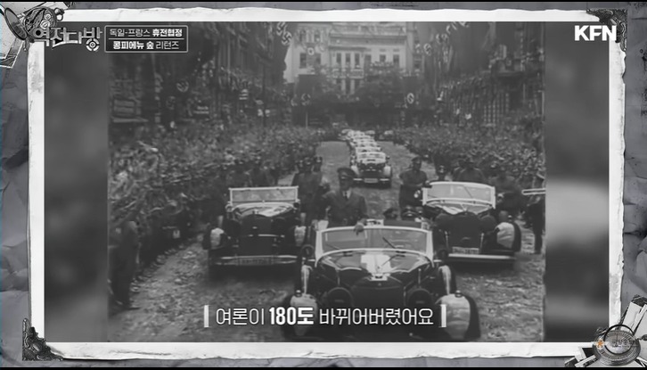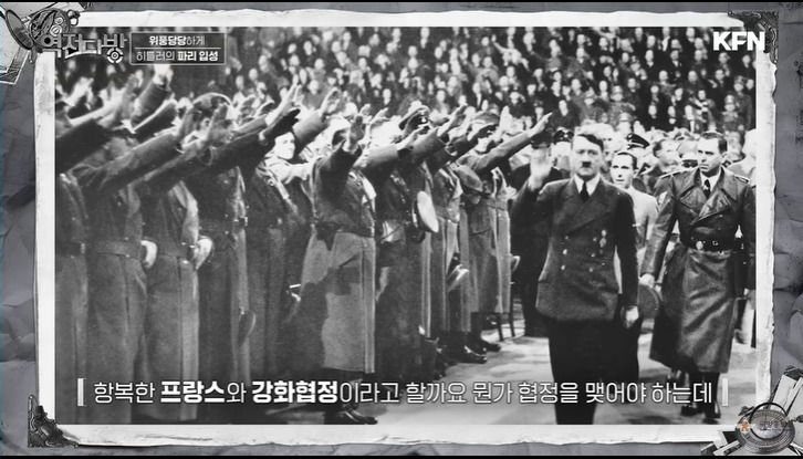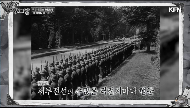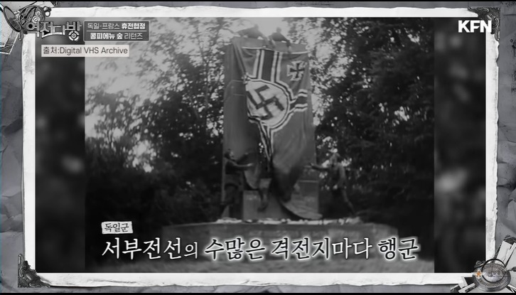 히틀러는 쇼맨십의 귀재였다.항복 문서 작성을 역사적인 곳으로 하게 된다.1차대전 종전 협상을 콩피에뉴 숲 열차에서 했는데 이거에 대한 치욕을 갚아주마 하며 여기를 항복 문서를 접수하는 곳으로 낙점하게 된다.당시 사용했던 열차가 박물관에 있었는데 이거를 꺼내와 콩피에뉴 숲으로 가져온 다음 항복 조인식을 열게 된다.이 장면을 모두 촬영 독일 국민에게 보여주고 국민들은 나치에 열광하게 된다.