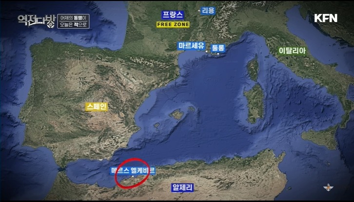 영국은 지중해에 남아있는 프랑스 해군을 어떻게든 처리해야 할 필요성을 느끼게 된다.영국 총리가 된 처칠은 프랑스에 함정을 이끌고 우리한테 오던지 아니면 모조리 자침시키라는 입장을 전달한다.프랑스는 큰 배신감에 휩싸이게 된다.땅 털린 것도 통탄할 일인데 해군을 내놓던지 자침시키라는 요구에 어의없어 한다.페탱은 영국과 대화를 하려 시도하나 영국은 다급했다.지중해에 있는 프랑스 해군 기지를 포격한다.폭격기도 출진하고 기뢰도 깔면서 프랑스 해군 함정을 모조리 깨부수려 시도하게 된다.이 과정에서 1300여명의 프랑스 해군이 사망하게 된다.페탱은 격분하여 영국을 적이라고 선언해 버린다.