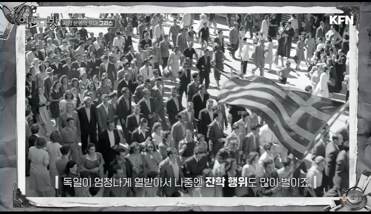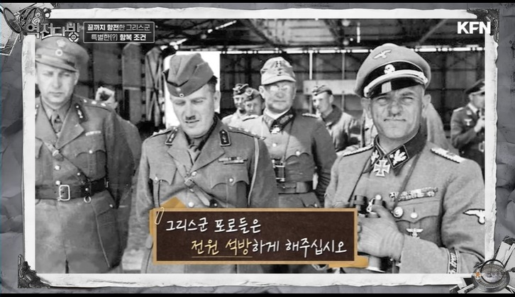 영국군이 철수할 때 그리스 곳곳에서는 환영 퍼레이드가 열리게 된다.그리스 시민은 비록 영국군이 독일군에 져서 철수하지만 잘싸웠다며 위로를 건네고 꼭 다시 돌아오라며 배웅을 해주게 된다.독일군도 고무된다.고대 서양 문명 발상지를 우리 독일인이 먹다니 감격해 한다.독일은 처음에는 그리스인에 호의적으로 대해주게 된다.하지만 시간이 갈수록 그리스가 나라를 되찾겠다며 곳곳에서 저항을 펼치자 나치는 강경 진압을 하게 된다.