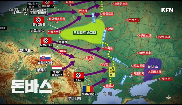 남부는 더 힘들었다.루블린 리바우 이쪽은 1차대전 브루실로프 공세가 펼쳐질 정도로 어려운 전선이 앞에 버티고 있다.그다음 현재의 우크라이나로 들어가야 했다.우크라이나에서 남쪽의 가장 큰 목표인 돈바스에 가야 했다.너무 땅이 넓어서 한번에 가면 좋겠지만 그럴 수는 없었다.프랑스를 먹을 때 처럼 적을 양익포위로 포켓에 가두고 바둑돌 따먹듯이 적을 잡아야 했다.최대로 진격할 때마다 진격로에 저항하는 적을 감싸서 바둑돌처럼 드러내고 또 다시 양익을 벌리고 적을 감싸서 포위 섬멸하고 이런식으로 계속 하면서 전진해야 했다.