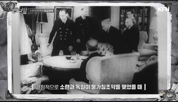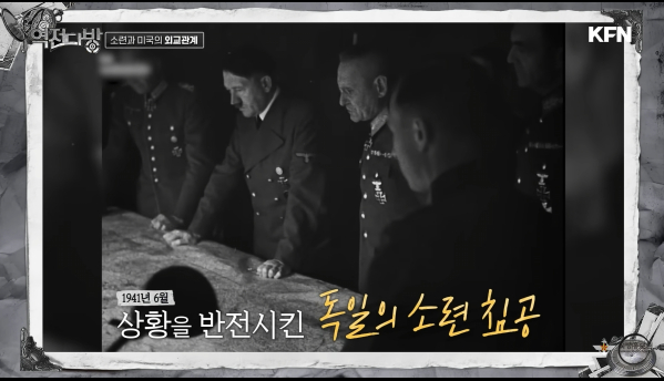 독일의 소련 침공은 물과 기름과 불이라 할 수 있는 세나라 미국,영국,소련을 하나로 뭉치게 한다.미국과 영국 역시 겉으로 내색은 안하나 서로 섞일 수 없었다.미국은 자유경제를 추구하나 영국은 식민지가 많아 블록경제를 선호하고 있었다.영국이 먼저 소련에 한 발 물러서는 입장을 보이게 된다.처칠은 공산주의가 싫지만 독일이라는 적을 부수기 위해 소련과 손을 잡을 수 있다는 의견을 피력하게 된다.미국은 처음에는 중립이였다가 독일이 파리를 먹고 영국마저 무너지며 안된다며 조심스럽게 무기대여법을 지정 간접 참전을 하게 된다.
