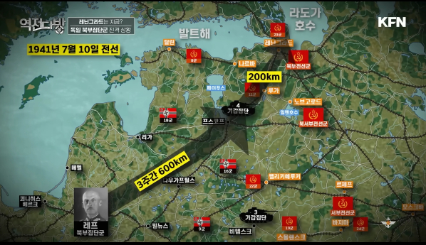 히틀러는 남쪽과 북쪽이 평정되면 그 후에 모스크바로 돌진하라는 예비 명령을 내리게 된다.북부집단군은 하루빨리 레닌그라드를 함락해야 했다.독일군이 주춤하고 있는 사이 레닌그라드에 수병까지 방어에 합류하게 된다.레닌그라드 뒤에는 발트함대가 버티고 있었다.군함이 함포 사격을 때리자 독일 기갑 부대들은 더 공격했다가 가루가 된다며 진격을 멈추게 된다.정면승부를 버리고 고사작전에 돌입하게 된다.