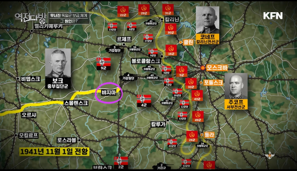 독일의 보급은 일단 큰 곳은 철도로 하고 간선은 차와 말로 운반하는 시스템이였다.뱌지마가 철도 교통의 핵심이였다.철도 교통의 문제는 독일의 기차폭과 소련의 기차폭이 다르다는 것이였다.철로를 사람이 직접 독일 기차에 맞게 맞추고 있었다.철도를 고정하는 못을 빼고 레일을 들어올리고 폭을 맞춘후 레일을 설치하고 다시 못을 박는 식이였다.모든 것은 수동이여서 더딘 상황이였다.소련 기차를 그대로 이용하는 방법도 있었으나 독일군은 초기에 신나서 소련 기차를 다 때려부수는 대형 실수를 하고 있었다.